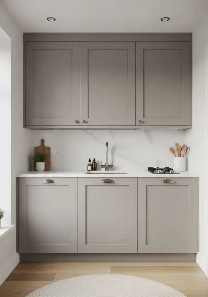 Choose warm whites, soft creams, pale warm greys, or gentle sage greens rather than pure cool white or stark bright white — warm-toned light colors create a kitchen that feels simultaneously spacious and warmly inviting, while very cool whites can create a clinical, unwelcoming quality particularly in north-facing kitchens with limited natural light. Paint the walls in a tone even slightly lighter than the cabinet color to create the most continuous, most seamlessly expanded visual experience throughout the tiny kitchen’s complete surface area.