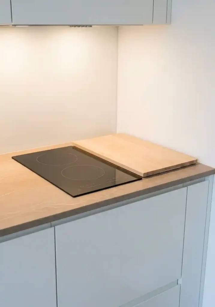 A portable induction cooktop installed in a custom-cut counter opening creates a cooking surface that is flush with the counter plane, eliminating the raised lip and the visual separation between cooktop and counter that conventional range installations create. When not in use, a custom-cut cutting board cover sits flush over the induction surface, creating a completely uninterrupted counter plane that functions as additional preparation space. This installation approach is particularly appropriate for tiny kitchens where the conventional range installation consumes floor space that a counter-mounted cooktop reclaims.