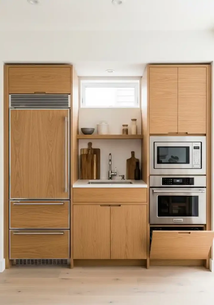 Concealing appliances behind matching cabinet panel fronts creates the most visually seamless and the most specifically resolved tiny kitchen surface available — when the refrigerator and dishwasher share the same panel material and finish as the surrounding cabinetry, the kitchen reads as one unified architectural composition rather than as cabinetry interrupted by multiple appliance faces in competing materials. This visual unification is particularly valuable in a tiny kitchen where every visual complexity makes the space feel more crowded and more chaotic than it actually is.