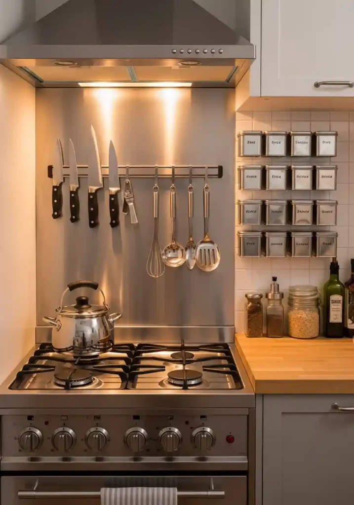 Install a stainless steel sheet, a painted steel panel, or a purpose-built magnetic kitchen panel at a comfortable reach height beside the stove where cooking tools are most frequently needed. A panel of approximately forty-five by ninety centimeters creates the largest usable magnetic surface within standard wall dimensions. Choose accessories that are designed for magnetic kitchen panels — purpose-built magnetic hooks, spice tins with strong magnets, and knife strips with appropriate magnetic strength — rather than relying on household magnets that may not hold kitchen items securely.