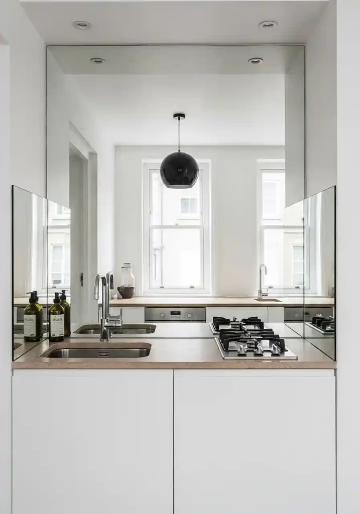 A full mirrored splashback covering the wall behind the counter creates the most dramatically space-amplifying visual effect available in a tiny kitchen through a single surface material choice — the mirror reflects the opposite kitchen wall, any window, and all available natural light, creating the impression of a second identical kitchen existing beyond the mirror surface. This visual doubling of depth makes the tiny kitchen feel significantly more generous and more specifically spacious than its actual dimensions. The reflected light also amplifies the kitchen’s brightness throughout the day.