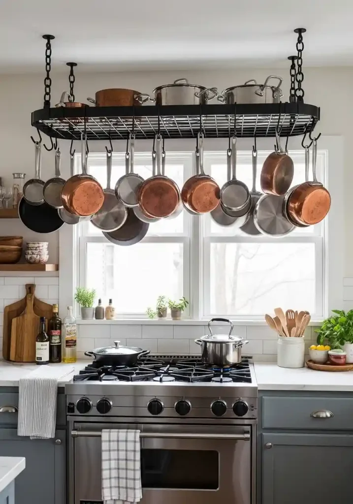 23. Overhead Pot Rack for Ceiling Storage Utilization