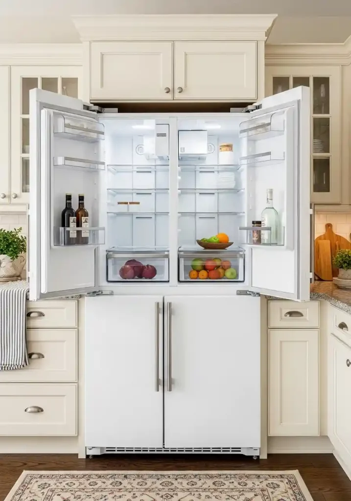 A counter-depth French door refrigerator with two half-width doors requires significantly less swing clearance than a conventional single full-width door refrigerator — each narrow half-door swings only half the depth of a full-width door, reducing the clearance zone required in front of the refrigerator by approximately thirty to forty percent. In a tiny kitchen where the refrigerator door clearance zone frequently constrains the usable floor space and limits the kitchen’s comfortable circulation, this clearance reduction is a meaningful improvement in the kitchen’s daily functional quality.
