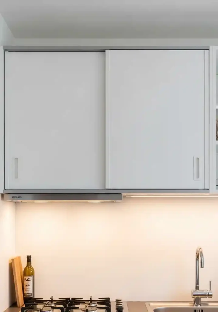 Sliding cabinet doors eliminate the clearance zone that conventional swing-out doors require in front of the cabinet — in a tiny kitchen where counter-to-opposite-wall clearance may be limited to ninety or one hundred centimeters, a conventional upper cabinet door swinging outward consumes a significant portion of the available movement space and can create genuinely impractical access conditions. Sliding doors that move laterally across the cabinet face require zero clearance beyond the cabinet’s face and make the tight kitchen clearance genuinely functional for comfortable daily use.