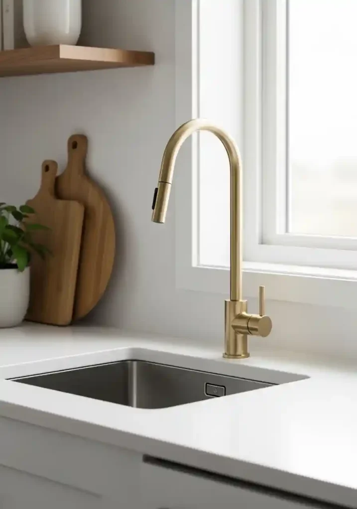 Choose a faucet with a high gooseneck profile rather than a low-arc profile — the high gooseneck creates clearance to fill tall pots and clean tall items without angling them awkwardly beneath a low-clearance spout. A single-handle faucet rather than a double-handle design reduces the visual complexity of the faucet assembly and simplifies daily use. The faucet finish should coordinate with the kitchen’s other hardware finishes — choosing a matching or complementary finish to the cabinet hardware creates the most cohesive and the most specifically resolved tiny kitchen aesthetic.