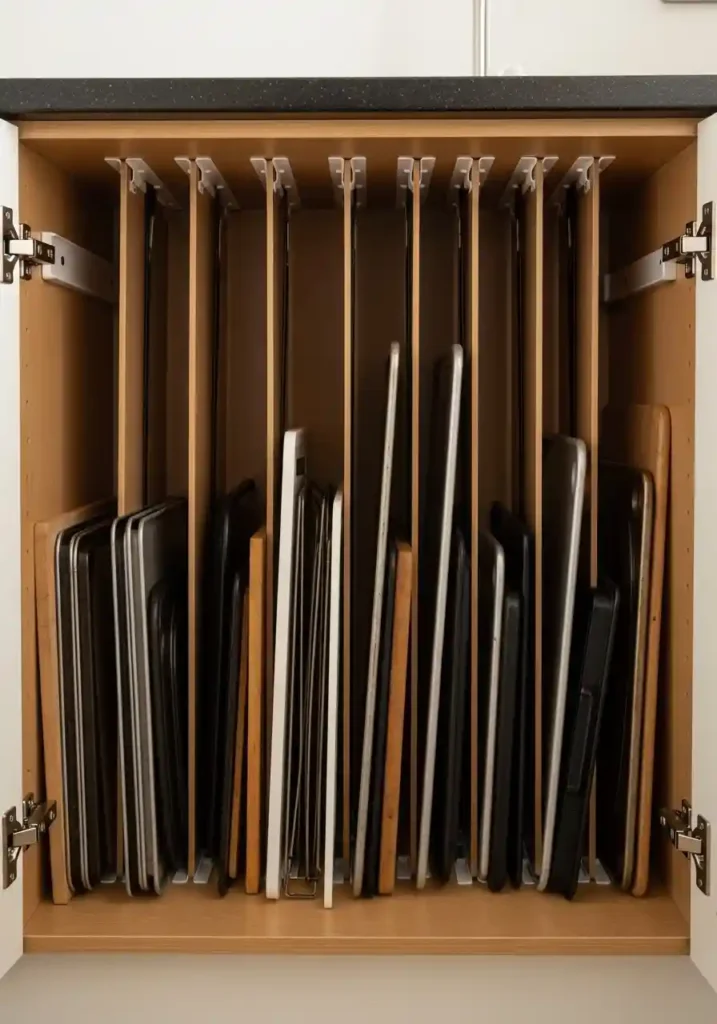 Tension rods for vertical pan dividers are installed between the cabinet’s top interior surface and the shelf or base below, spaced approximately eight to ten centimeters apart to create individual slots appropriate for most standard baking pan widths. The tension rod installation requires no tools and no permanent modification — rods are simply expanded to fit the cabinet’s interior height with spring pressure. A set of five to seven tension rod dividers across one lower cabinet creates a complete flat pan filing system that dramatically improves one of tiny kitchens’ most consistently frustrating storage scenarios.