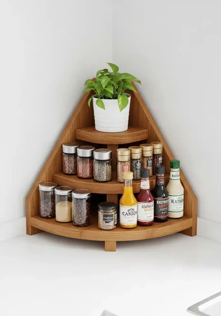 Choose a tiered corner shelf in a material that complements the kitchen’s existing materials — a warm wood corner shelf against a white counter, a marble-look acrylic shelf against a stone counter, or a stainless steel corner shelf in a professional kitchen aesthetic. The tiered corner shelf specifically suits the organization of small, frequently accessed items — spice jars, small condiment bottles, cooking oils, and small utensil cups — that benefit from accessibility and visibility. Keep the corner shelf curated rather than filled with overflow to maintain the visual organization that makes the tiny kitchen feel most specifically designed.