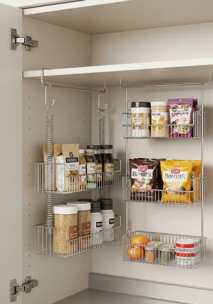 Under-shelf hanging baskets clipped to the bottom of cabinet shelves create additional suspended storage tiers within existing cabinets without any permanent installation or modification — the spring-clip mounting system allows the baskets to be attached, removed, and repositioned at any time. Each basket effectively adds a storage tier within the cabinet by using the space between the shelf surface and the items stored on the shelf below, which in most cabinet configurations goes completely unused. A set of four under-shelf baskets installed across the kitchen’s upper cabinets creates meaningful additional storage capacity at zero installation cost.
