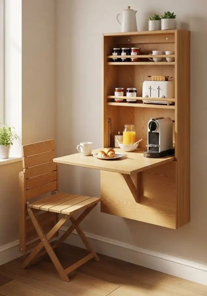 A small fold-out wall shelf specifically sized and positioned for the coffee maker or toaster creates a dedicated breakfast station that can be deployed for morning use and folded flush against the wall during the remainder of the day, returning the floor space below it to the kitchen’s general use area. This fold-out approach to small appliance station design applies the same zero-floor-space-when-folded principle of a fold-down dining table to a kitchen appliance use zone, creating dedicated function without permanent counter space commitment.