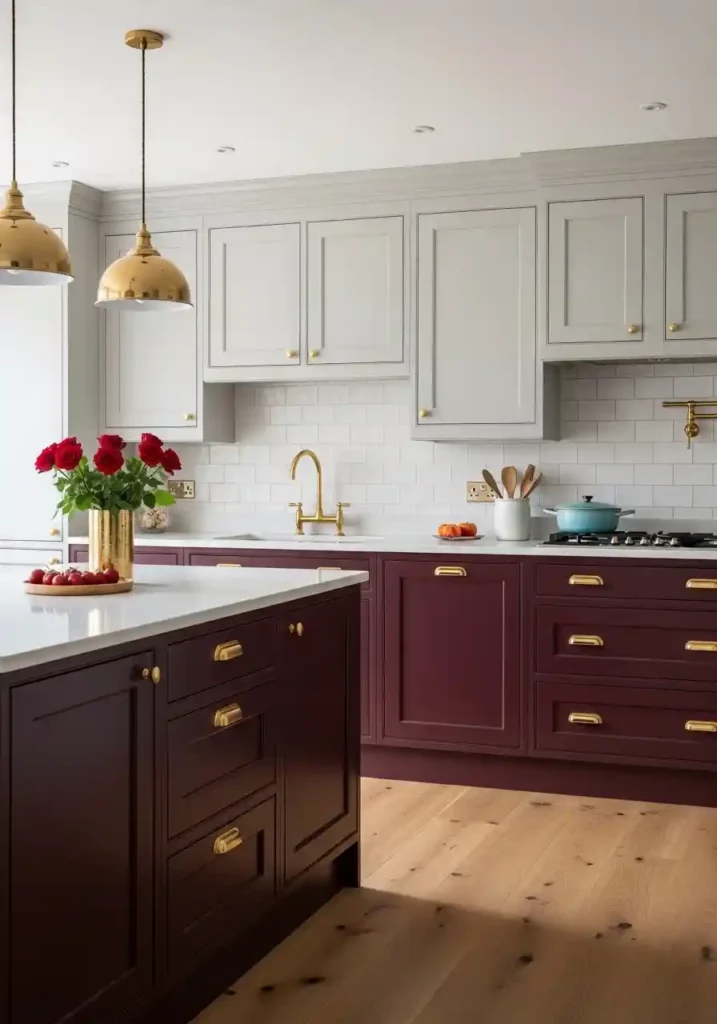 The most magnificently beautiful burgundy lower and pale grey upper two tone kitchen installations are those where the burgundy is genuinely warm and genuinely wine-toned — the specific warmth of authentic burgundy creating atmospheric richness that cool purples cannot approach! Warm polished gold hardware consistent throughout creating warm metallic harmony with the burgundy’s warmth. Warm cream quartz with warm undertones bridging the two colors beautifully. White handmade backsplash tile. Warm oak floor. Fresh deep red roses in gold vase. The burgundy and pale grey two tone creates extraordinary unexpected kitchen sophistication.
