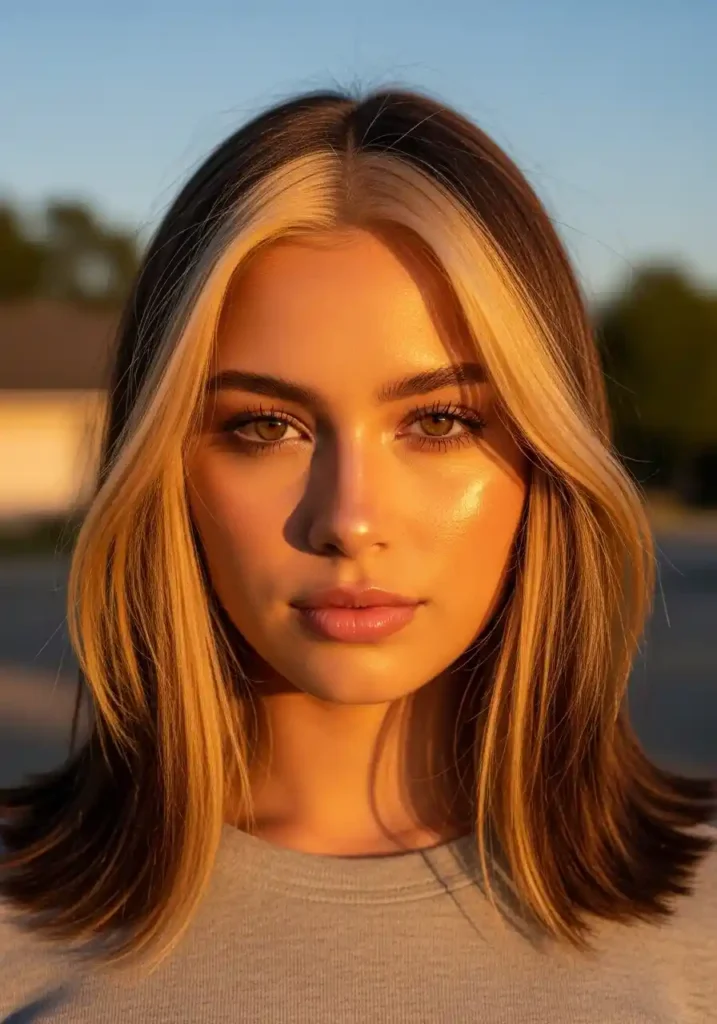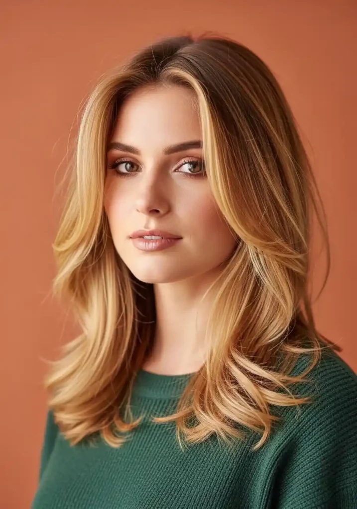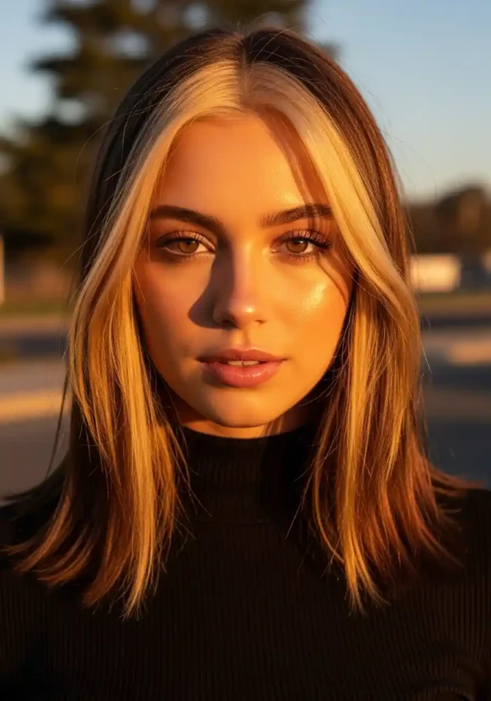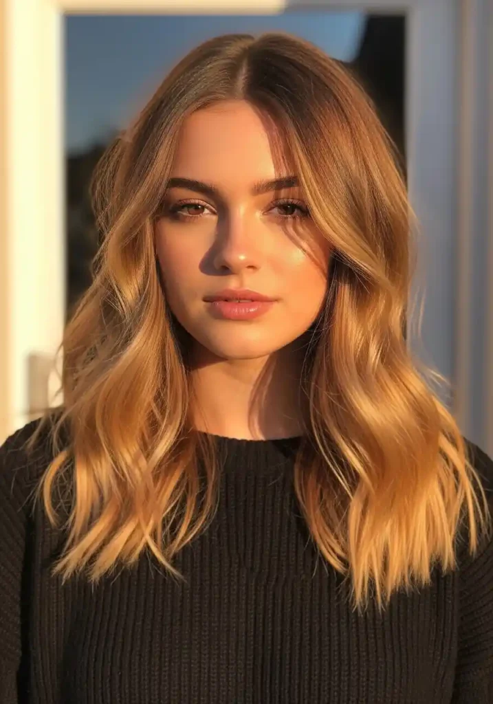 Face-framing warm blonde pieces create the most intimately cozy and most directly face-brightening version of the warm blonde look — by concentrating the warm golden luminosity specifically in the two sections flanking the center part that fall most directly alongside the features, this technique creates an intimate warmth immediately adjacent to the face that no other warm blonde placement can replicate with the same directness. The warm sections essentially frame the face with a continuous warm glow that illuminates the features from the outside inward.