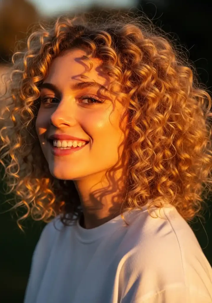 Warm golden blonde on natural curly hair creates a uniquely bouncy and joyfully warm version of the cozy-bright warm blonde look — the curl pattern displays the warm golden color in a completely unique way, with each spiral’s outer curve catching warm light most brilliantly while the inner curve shows the slightly deeper warm gold in relative shadow, creating a continuously shifting warm display of the golden tone that appears most alive and most joyfully cozy in natural warm light.