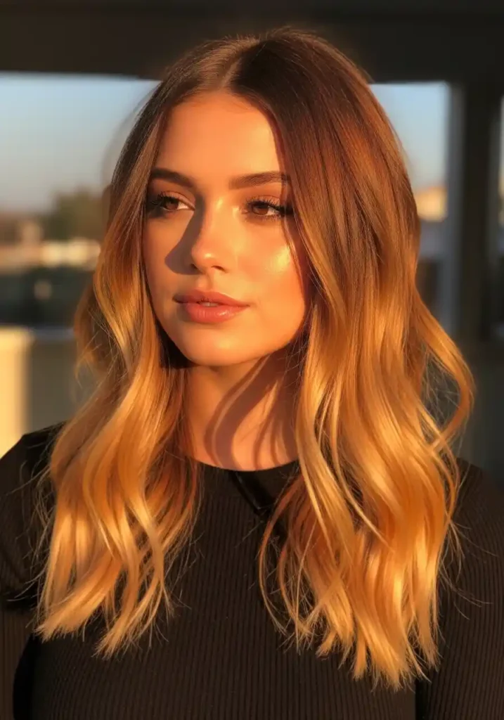 The specific warmth of every ombre stage creates a color that appears as though the hair has been warmed progressively from root to end rather than simply lightened — the roots carry the deep, warm earth-warmth of a warm brunette, the mid-lengths carry the intermediate amber warmth of caramel, and the ends carry the bright, luminous warmth of golden blonde. This progression feels genuinely organic and genuinely sun-touched rather than obviously processed. A warm golden gloss unifies all stages every eight weeks.