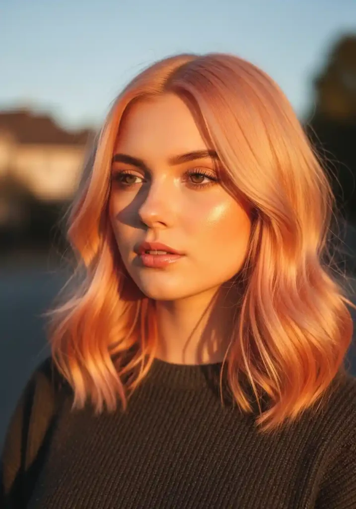 The soft warmth of warm peach blonde is most beautiful in the specific light conditions it most closely references — warm evening indoor light, the soft glow of late afternoon sun, the gentle warmth of a candle-lit room. In these environments, warm peach blonde develops a quality of extraordinary soft warmth and intimate cozy brightness that more vivid or more saturated warm blondes cannot replicate at the same level of soft, romantic gentleness. Maintain with a warm peach depositing conditioner weekly and a professional warm peach gloss every six to eight weeks.