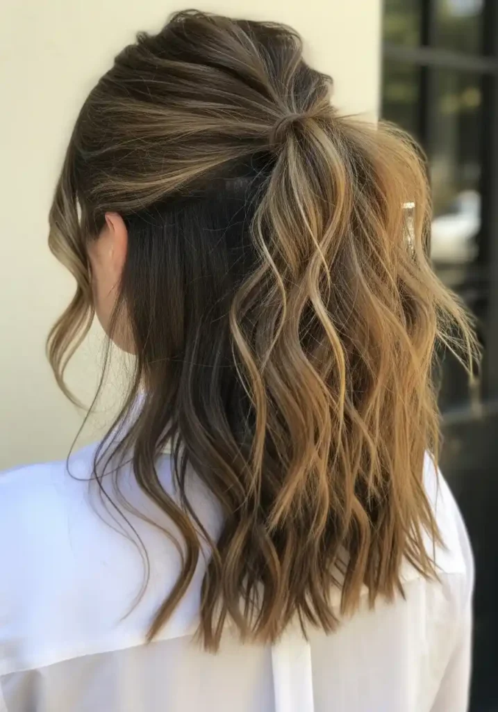 The half-up half-down style on naturally wavy hair is one of the most effortlessly pretty and genuinely natural-looking everyday hairstyle expressions available, combining the casual elegance of a partially gathered crown with the free-flowing, movement-rich beauty of naturally wavy lengths to produce a style that appears completely spontaneous and authentically beautiful rather than deliberately constructed for any particular visual effect. The waves throughout both the gathered top section and the freely flowing lower lengths create a continuous textural character that gives the half-up style a naturally cohesive quality, with the wave pattern flowing organically through both the structured and the unstructured elements of the style in a way that makes the two areas appear genuinely unified rather than aesthetically separate from one another.