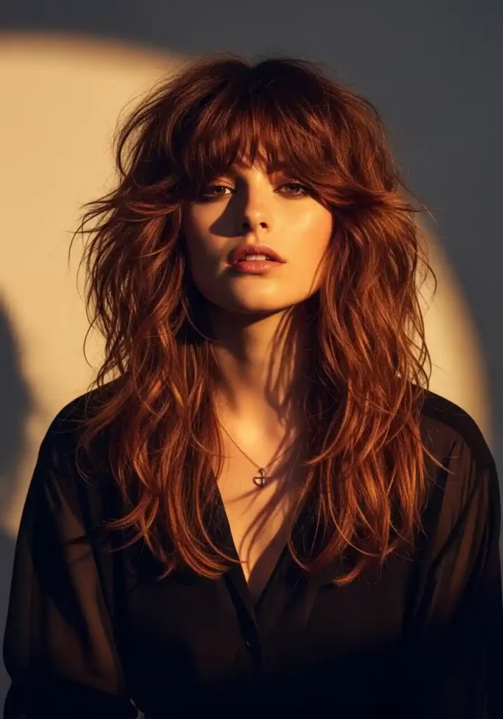 The textured shag with pronounced face-framing layers and wispy bangs is a haircut with an almost musical quality — every element plays a specific role in a larger composition, and when they all work together, the result has a rhythm and harmony that makes it genuinely beautiful from every angle. The heavy interior layers create body and movement throughout the length. The face-framing layers graduate from longer at the back to shorter at the front, creating a frame that surrounds the face like a perfectly proportioned picture frame. The wispy bangs complete the composition at the top.