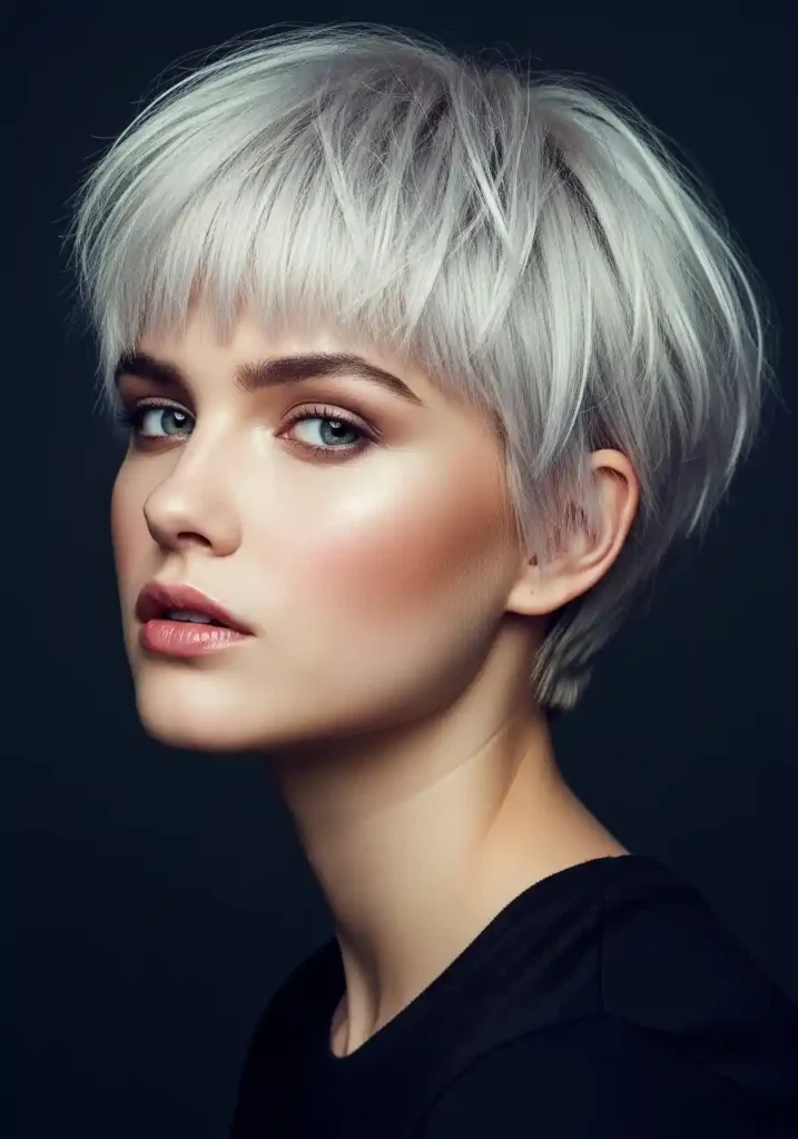 The texture throughout a pixie-bob should be built in by the stylist using point-cutting and slide-cutting techniques that create layers with graduated, feathery ends throughout — the same technique applied to the bang section creates the wispy fringe that frames the face. On platinum blonde or very light hair, this cut has an almost ethereal quality — the pale, light-reflecting color and the deliberately delicate texture of the wispy bangs create a look that is simultaneously minimal and visually extraordinary. Style with a small amount of light-hold texture paste and your fingertips for a finish that expresses every layer’s individual character.