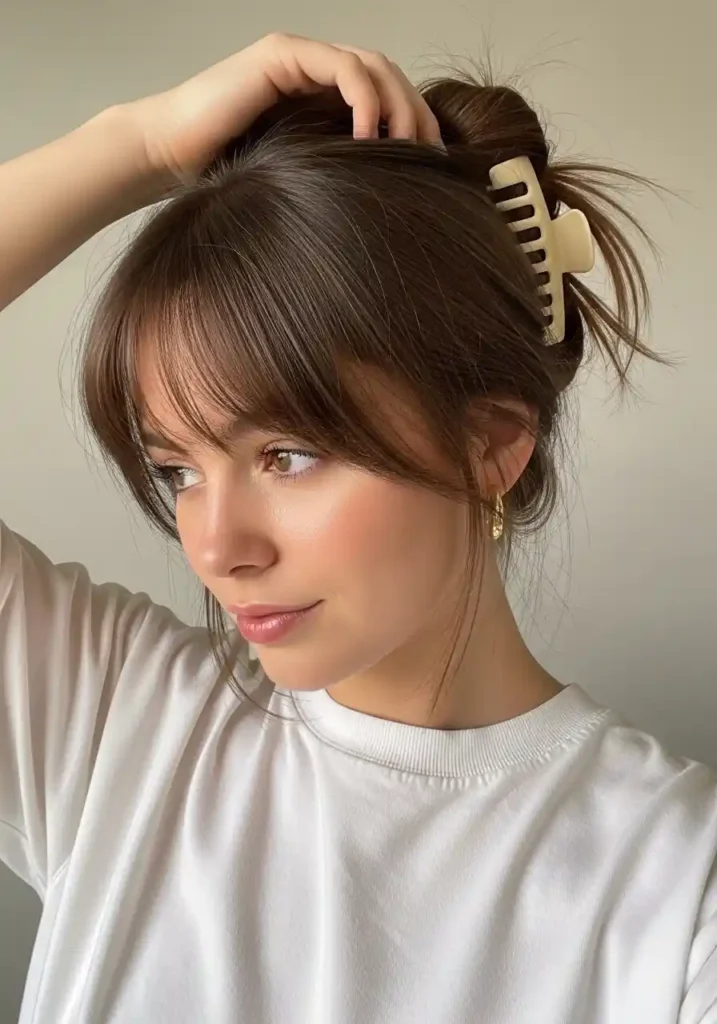 12. Wispy Bangs with a Casual Claw Clip Upstyle